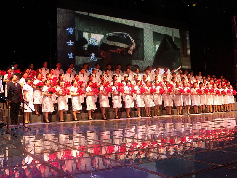 绚丽的灯光、震撼的音响,让晚会现场的人们热情高涨,心潮激荡。白求恩第二医院教职人员的大合唱《白求恩还在我们当中》波澜起伏、气势昂扬;白求恩口腔医院的诗朗诵《天使的赞歌》情感真挚;第三幼儿园的小朋友和老师们表演的舞蹈充满了天真童趣和对未来的憧憬;活力四射的歌舞《激越•青春》点燃了在场观众的激情,把晚会推向高潮。